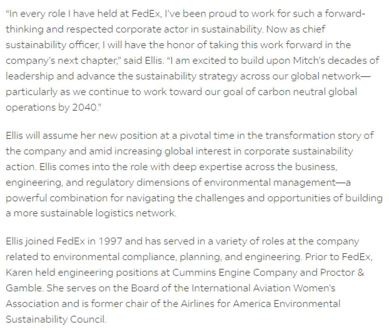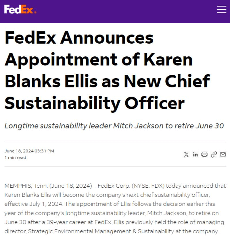 联邦快递集团近日宣布,凯伦·布兰克斯·埃利斯 (Karen Blanks Ellis) 将成为公司下一任首席可持续发展官,该任命将于2024年7月1日生效。 Ellis的任命是在该公司长期担任可持续发展负责人的米奇·杰克逊 (Mitch Jackson) 今年早些时候决定于6月30日退休之后做出的,杰克逊在联邦快递工作了39年。Ellis此前曾担任该公司战略环境管理和可持续发展董事总经理。 图源:联邦快递官网 “在联邦快递担任的每个职位中,我都为能为这样一家具有前瞻性思维且受人尊敬的可持续发展企业工作而感到自豪。现在,作为首席可持续发展官,我将有幸在公司的下一个篇章中继续推进这项工作,”Ellis说。“我很高兴能够在米奇数十年的领导下继续前进,并推进我们全球网络的可持续发展战略——尤其是在我们继续努力实现到 2040 年实现全球碳中和运营的目标之际。” Ellis将在公司转型的关键时刻出任新职位,而全球对企业可持续发展行动的兴趣也日益增加。埃利斯在担任新职位时,在环境管理的业务、工程和监管方面拥有深厚的专业知识——这是应对构建更可持续的物流网络的挑战和机遇的强大组合。 图源:联邦快递官网 Ellis于1997年加入联邦快递,在公司担任过与环境合规、规划和工程相关的各种职务。在加入联邦快递之前,Ellis曾在康明斯发动机公司和宝洁公司担任工程职位。她是国际航空妇女协会董事会成员,曾担任美国航空环境可持续发展委员会主席。