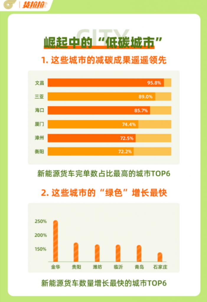 中国交通运输协会城市交通分会联合货拉拉发布《数说绿色货运·2024城市货运减碳数据报告》。 报告显示,从去年十月到今年十月,货拉拉平台40%的订单由新能源货车完成,新能源货车跑过的里程达74亿公里,加起来可绕地球赤道18.5万圈,相比用油车运输减碳142万吨,相当于7887万棵树一年的二氧化碳吸收量。 各大城市在“减碳”上也开始“使劲”,海南文昌新能源货车的完单占比高达95.8%,浙江金华新能源货车数量增长超2倍。此外,货拉拉“绿途行动”合作建设新能源电站8.6万座,94万个新能源充电桩,覆盖338个城市,充电量达9亿千瓦,累计为司机节省加油、充电成本超2亿元。 图源:中国网科技 2015年,货拉拉平台出现了第一位新能源货车司机。近三年,货拉拉平台新能源月活司机逐年增长,由22.9%上涨至28.8%,这也意味着,将近30%的货车司机不再为夏天开空调耗油而苦恼,实现了“空调自由”。 图源:中国网科技 除此之外,大车司机里的“减碳先锋”也在不断发展壮大,超2万位大车司机过去一年里将油车换至新能源车,摆脱了跑长途时睡在油箱下的困境。部分货车司机在将油车换至新能源车后,实现了降本增效。比如货车司机张师傅2022年换车后至今累计节约跑车成本超8万元。 随着新能源货车的普及,货运“低碳脚印”也逐渐遍布大江南北。《报告》显示,新能源货车司机注册的最东城市为黑龙江佳木斯市,最南城市为海南三亚市,最西城市为新疆喀什市,最北城市为黑龙江黑河市。从南到北,从东到西,都可以看见新能源货车司机注册的踪迹。 流动的新能源货车也让互联网货运“绿色”发展的底色更加鲜明。近一年,货拉拉平台出现的最远完单距离为3809公里,来自武汉的王师傅将装修建材从江西赣州运往新疆乌鲁木齐,历时八天,相比用油车运输减少碳排放1014千克。