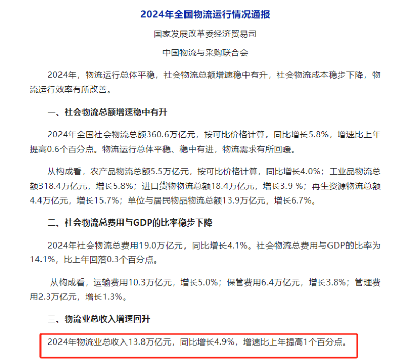 国物流与采购联合会发布的数据显示,2024年中国物流市场规模保持平稳增长,全年物流业总收入13.8万亿元(人民币,下同),同比增长4.9%。 截图图源:中物联物流枢纽与园区分会公众号 物流与产业深度融合,综合服务竞争力持续提升,2024年头部物流企业物流业务收入规模超过2万亿,占全行业比重超过16%。从行业主体看,据第五次全国经济普查数据显示,当前我国物流相关法人单位超过90万个,个体经营户超过810万个。 我国物流岗位从业人员超过5500万人(包括物流相关行业法人单位和从事物流活动的个体工商户从业人员,也包括工业、批发和零售业等行业法人单位的物流岗位从业人员)。物流相关行业法人单位从业人员数由2018年的1100万人增至1550万。新业态领域快速增长,吸纳就业能力不断增强,即时配送等新业态领域从业人员增长超过50%,明显高于同期城镇就业人员增长平均水平。 物流供需协同性不断增强,为经济平稳增长提供重要保障。从物流与经济数据对比来看,物流实物量增速持续高于经济增长、物流活跃性良好,全年各季度社会物流总额增速均维持5%以上,均高于同期GDP增长;全年景气指数均值为51.7%,呈“前稳后升”格局,与货运量运行态势同步。 值得一提的是,2024年全年全国社会物流总额,即经济运行中的物流实物量价值总额,为360.6万亿元,同比增长5.8%,增速比2023年全年提高0.6个百分点,其中,工业品物流总额增长5.8%,贡献率达77%,依旧是增长主力。 图源:央视新闻客户端