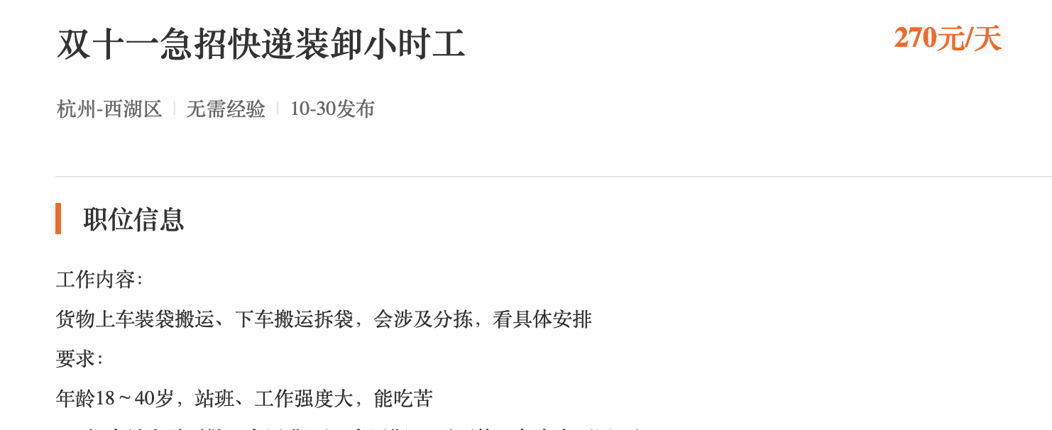 今晚,“尾款人”将会支付双十一第一阶段的尾款。这意味着,双十一的一大波快递即将发出。 快递公司近日开启“囤人”模式。据媒体报道,杭州某快递点发布招聘临时快递员的海报,称急招年龄在20岁到60岁之间的临时工,为应对即将到来的快递高峰。海报上显示,日薪最低300元,推荐他人上岗还可领取100个鸡蛋,“鼓励叔叔阿姨来应聘”。 “确实是缺临时快递员。”10月29日,时代周报记者在某一线城市走访多家快递网点了解情况,工作人员称双十一临近,确实需要临时快递员帮助做分拣、理货、装袋等工作,“加快派送速度”。但是对临时快递员不包吃不包住,每单提成1.5元或者更高,能力强的每天送300单以上,“月入过万,是有可能的”。 不仅是线下招募,时代周报记者在招聘平台上也看到不少快递员、分拣员的招聘帖子,“工资日结”“月薪过万”等成为招聘信息关键词。根据用人单位贴出的薪资信息,快递员基本月薪是6000元-8000元,最高可至15000元。“急聘”“无需经验”“就近安排”等字眼也能看出用人单位的紧迫。 近段时间,快递员招聘的帖子变多。 快递网点工作人员称,“招人难是快递行业常态”。她表示,由于快递员有时要拎着几十斤麻袋爬楼,需要能吃苦,体力强,“并不是每个人都能适应的”。 临时快递员派送费或更高 本轮快递高峰从11月初开始。中国快递协会此前对媒体表示,本轮快递高峰预计从2022年11月初至2023年春节前夕结束,共82天。据菜鸟方面透露的数据显示,预计今年双十一快递送货上门量将创下历史最高值。 为此,快递从业人员的缺口急需补上。那么,月薪万元招快递员的现象会否持续整个快递旺季? 记者走访多个快递网点了解到,2022年快递高峰将在11月1日之后开启,预计到11月20日左右结束。双十二的电商活动折扣力度相对较小,消费者购物量不如双十一。因此,快递网店工作人员认为,11月20日后的快件量对整体运力影响不大。 该网点工作人员称,的确存在缺人的情况。以该网点为例,目前共有十几人,由于双十一单量激增,需要招聘五到六名临时快递员,帮助快递员做分拣、理货等工作,以此加快派送速度。 但和毫无经验的新人相比,该网点工作人员称更倾向于有经验的快递员,“他们能更快、更好上手”。对方还称,招聘临时快递员确实是不限制性别和年龄,但考虑到消费者在双十一囤的货物可能为沐浴露、洗发水等重物,从体力来说男性搬运起来会更容易,女性多数是分配到分拣、理货等相对轻松的工作。 对于有报道称“杭州快递员日薪最低300元”,该网点工作人员称,“这个薪资是有可能的”。 她介绍,以她所在的网点是管住不管吃,正式快递员派送费为1.5元/单,每日至少需配送200单左右。“有经验的一天300单,闭着眼睛就送完了,下午五点就能下班”。此外,快递员上门取件的话,每单能挣6元左右。“本身而言,送快递月入过万,并不罕见。” 考虑到双十一快件量剧增,快递员需每天配送500-600件快递。以1.5元/单计算,一个成熟的快递员在20天内完成日均500单,派费就达到1.5万元。 该网点工作人员表示,为了加快派送速度,他们会以1.5元/单或更高的的派送费来招聘临时快递员。但是,网点不会为他们提供食宿,扣除这些生活费用后,到手的钱可能不如正式员工多。 “招人难是常态” 双十一前,快递公司“囤人”是常态。 时代周报记者在部分招聘平台上看到,10月下旬开始,急招快递员、分拣员等的招聘信息开始增多,招聘条件也不俗。“包吃住”“免费用车”等已经是基本条件,部分公司直接在岗位写明“只派送不装卸”“配车、就近分配”,有的甚至明确标注“只要求派送一个点位”。 待遇方面,快递员招聘的帖子基本以6000元为起步工资,有的上限甚至达到了1.5万元。而一些招募长期快递员的帖子还打出“享受工龄、防寒防暑补贴,年假年终奖”“购买社保五险和商业保险,有婚假、陪产假”“薪资可预支”等额外福利。 有贴出临时快递员招聘信息的快递网点对媒体表示,来打听的人多,很多人一听工作时长就放弃了。近些年双十一活动时间越来越长,配送高峰也延长了,只能靠高薪留人了。 优厚的待遇背后,是快递行业的招人难问题。根据58同城、赶集直招发布的2022年三季度人才流动趋势报告,三季度58同城、赶集平台上快递分拣员招聘需求同比上升69.27%。 前述快递网点工作人员认为,快递行业需要体力强,能吃苦的人,“并不是每个人都能适应的”。她举例称,该网点快递员需6点半起床干活,把快递分拣后会把一栋楼的快递都放在同一麻袋里。如果该楼没有电梯,快递员需要拎着几十斤重的麻袋从一楼爬到6楼,逐一派送到客户家门口,对体力要求较高。此外他们下班没有固定时间,“什么时候派送完,就什么时候下班”。 前段时间,她所在的网点受疫情影响,有员工在半个月内只工作了五天,重新回到工作岗位后,由于难以适应高强度的工作,最后也选择了辞职。 除此之外,快递员还需要承担时间和考核罚款的压力。由于快递车会在不同时间段多次送货,因此快递员需在某固定时间段前内送完快递并保证被签收。当发生快递延时和被投诉的状况时,快递员会被公司发罚款。如果发生丢件的情况,快递员需照价赔偿,“曾经有人也赔了客户好几千元的手机”,该工作人员称。
