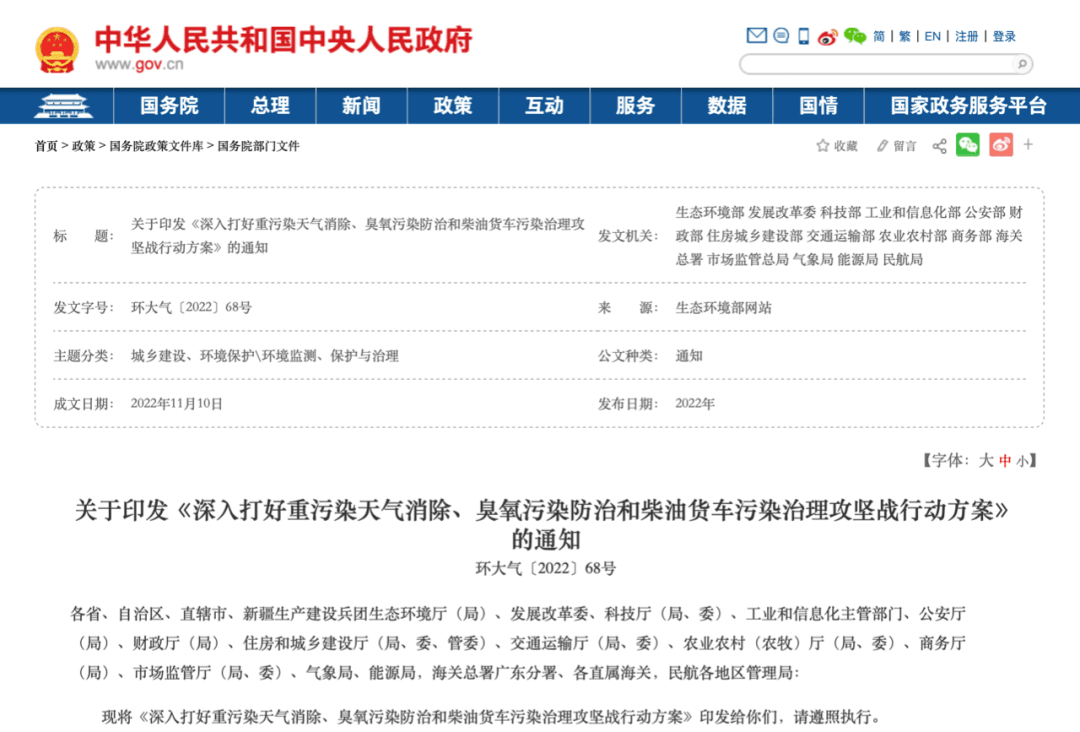 近日,生态环境部等15部门联合印发了《深入打好重污染天气消除、臭氧污染防治和柴油货车污染治理攻坚战行动方案》,聚焦重点地区、重点时段、重点领域开展集中攻坚,深入打好蓝天保卫战标志性战役。 《行动方案》包括1个总体文件,3个行动方案,即《重污染天气消除攻坚行动方案》《臭氧污染防治攻坚行动方案》《柴油货车污染治理攻坚行动方案》。《柴油货车污染治理攻坚行动方案》的重点地区有哪些?柴油货车污染攻坚战以货运量较大的京津冀及周边地区、长三角地区、汾渭平原相关省(市)以及内蒙古自治区中西部城市为重点,推动运输结构调整和车船清洁化,加强柴油货车和非道路移动机械监管,强化部门、区域协同防控。攻坚目标和主要措施分别是什么?攻坚目标为:到2025年,运输结构、车船结构清洁低碳程度明显提高,燃油质量持续改善,机动车船、工程机械及重点区域铁路内燃机车超标冒黑烟现象基本消除,全国柴油货车排放检测合格率超过90%,全国柴油货车氮氧化物排放量下降12%,新能源和国六排放标准货车保有量占比力争超过40%,铁路货运量占比提升0.5个百分点。 主要措施包括五项攻坚行动: 一是推进“公转铁”“公转水”行动,持续提升铁路干线货运能力,加快铁路专用线建设,精准补齐工矿企业、港口、物流园区铁路专用线短板; 二是柴油货车清洁化行动,推动传统汽车清洁化和全面达标排放,加快推动汽车新能源化发展; 三是非道路移动源综合治理行动,推进非道路移动机械清洁发展,实施非道路移动柴油机械第四阶段排放标准,强化排放监管,推动港口船舶绿色发展; 四是重点用车企业强化监管行动,推进火电、钢铁、煤炭、焦化、有色、建材(含砂石骨料)等重点行业企业清洁运输,强化重点工矿企业移动源应急管控,建立用车大户清单和货车白名单,实现动态管理。 五是柴油货车联合执法行动。完善部门协同监管模式,开展重点区域联合执法,推进数据信息共享和应用,建设重型柴油车和非道路移动机械远程在线监控平台,探索超标识别、定位、取证和执法的数字化监管模式。