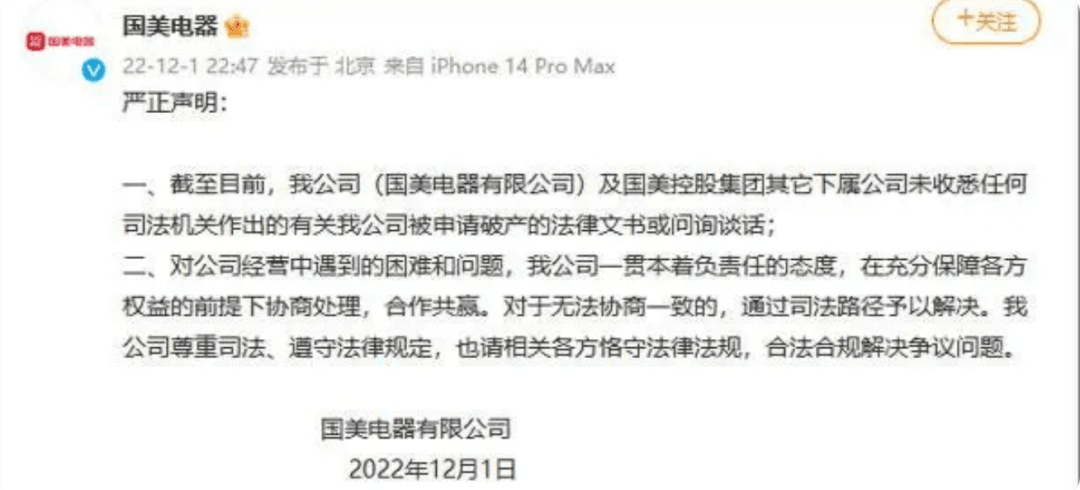 12月1日晚,针对“国美电器因欠款被申请破产清算”的新闻,国美电器发表严正声明,内容如下: 一、截至目前,我公司(国美电器有限公司)及国美控股集团其它下属公司未收悉任何司法机关作出的有关我公司被申请破产的法律文书或问询谈话; 二、对公司经营中遇到的困难和问题,我公司一贯本着负责任的态度,在充分保障各方权益的前提下协商处理,合作共赢。 对于无法协商一致的,通过司法路径予以解决。我公司尊重司法、遵守法律规定,也请相关各方恪守法律法规,合法合规解决争议问题。