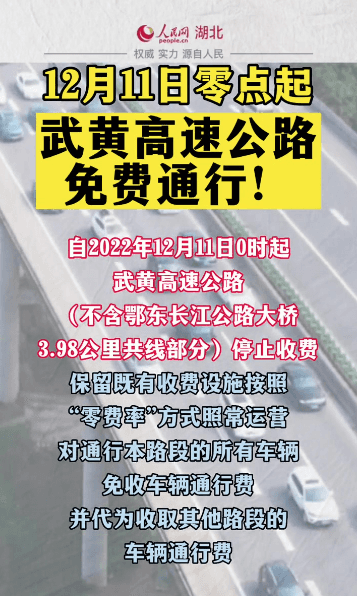 12月8日从湖北省交通运输厅网站获悉,武黄高速将于12月11日零点起免费通行,这也是全国第4条、湖北省首条收费期满免费通行的高速公路。 根据《收费公路管理条例》有关规定,自2022年12月11日0时起,武黄高速公路(不含鄂东长江公路大桥3.98公里共线部分)停止收费,保留既有收费设施按照“零费率”方式照常运营,对通行本路段的所有车辆免收车辆通行费,并代为收取其他路段的车辆通行费。 据悉,目前通行武黄高速小车通行费30元,货车100元左右。武黄高速是湖北首条高速公路,自武汉市关山一路南环铁路桥至黄石市黄石长江大桥,双向四车道,全长70.299公里,1991年元月通车。 武黄高速,串联武汉、鄂州、黄石三大工业城市,成为长江中游城市群协同发展的纽带。30年来,沿着武黄高速,周边新开发区如雨后春笋般涌现,旅游观光线不断延伸,成为湖北省鄂东经济发展的“铺路石”和“加速器”。 统计显示,武黄高速1991年、2021年日均通行车流量分别为3781辆、7.044万辆,30年间,日均通行车流量增长18.6倍;日均通行费收入分别为3.54万元、114万元,日均通行费增长32.2倍。是湖北单公里收入较高的高速公路之一。