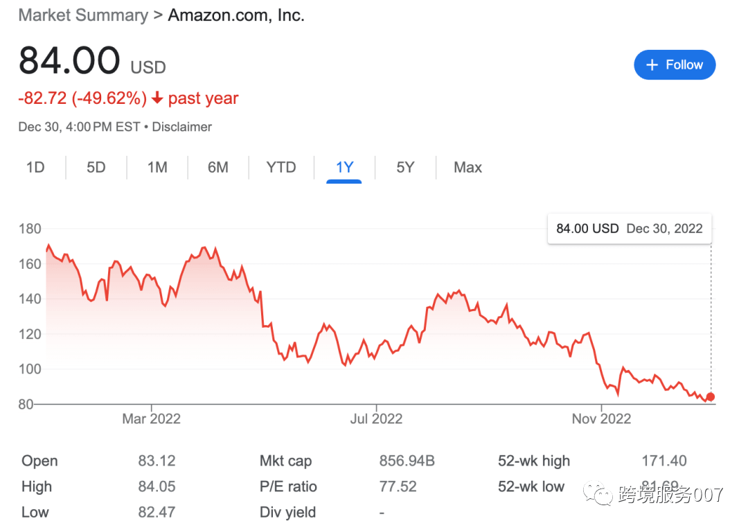 近期被卖家视为“扩容神器”的AWD仓,预约情况有点糟糕,一直在pending状态,即使有约也是1月份的事情了。 KRB7的仓库改约、不放约、入库接收异常慢,目前被改到5月份了,KRB7----目前拿约是pending的状态,建议着急交仓的卖家朋友换标改派。 极端天气,为物流派送各个环节带来了严重影响,空运、卡派、入仓都出现不同程度的阻滞。 亚马逊发言人Barbara Agrait 表示,“我们一直在跟踪各个地区的风暴美国,出于谨慎考虑,暂时关闭了受影响地区的一些站点,将继续监测天气模式,并在安全的情况下重新开放站点并恢复运营。” 尽管当下旺季已是尾声,但新年期间估计仍有一波购物潮,各位卖家请注意商品派送时效,有春节备货计划的卖家请与物流服务商保持沟通,关注尾端入仓情况。 美股2022年最后一个交易日结束!欧美跨境电商卖家最重要的电商平台亚马逊,股价暴跌近50%,全年市值蒸发8402亿美元,成为美股过去一年市值蒸发最多的公司! 全年下来,亚马逊股价暴跌近50%,跌到让很多亚马逊曾经的粉丝都想让姐夫重新回来担任公司CEO。 除了亚马逊,其他多个电商平台概念的美股股票在2022年也都表现惨淡! 独立站建站平台Shopify过去一年股价跌了74.80%,独立站这波打击也是相当大。 支付平台PayPal全年大跌62.23%,成为美股2022年市值蒸发排名第9的公司。 移动电商平台Wish股价一年跌去84.32%,现在Wish卖家的声音也是越来越小了。 倒是沃尔玛,线下实体加线上渠道同步开花,表现非常稳定,全年仅跌了2%,不愧是多年的全球财富五百强第一名的企业,经得起考验! 而拼多多,在国内进一步追近淘系的份额,海外则坐拥移动电商平台Temu,App上线一个多月时间就霸榜苹果购物类App榜单,拼多多最近两个月股价快速提升,全年涨幅达到40%! 不得不说是一匹黑马,Temu更加让人期待了! 对于很多跨境电商卖家来说,跟对平台非常重要,甚至可以说是一个关键的经营决策。 新的一年,亚马逊、沃尔玛、Temu,不妨都可以大力关注,顺势而为!