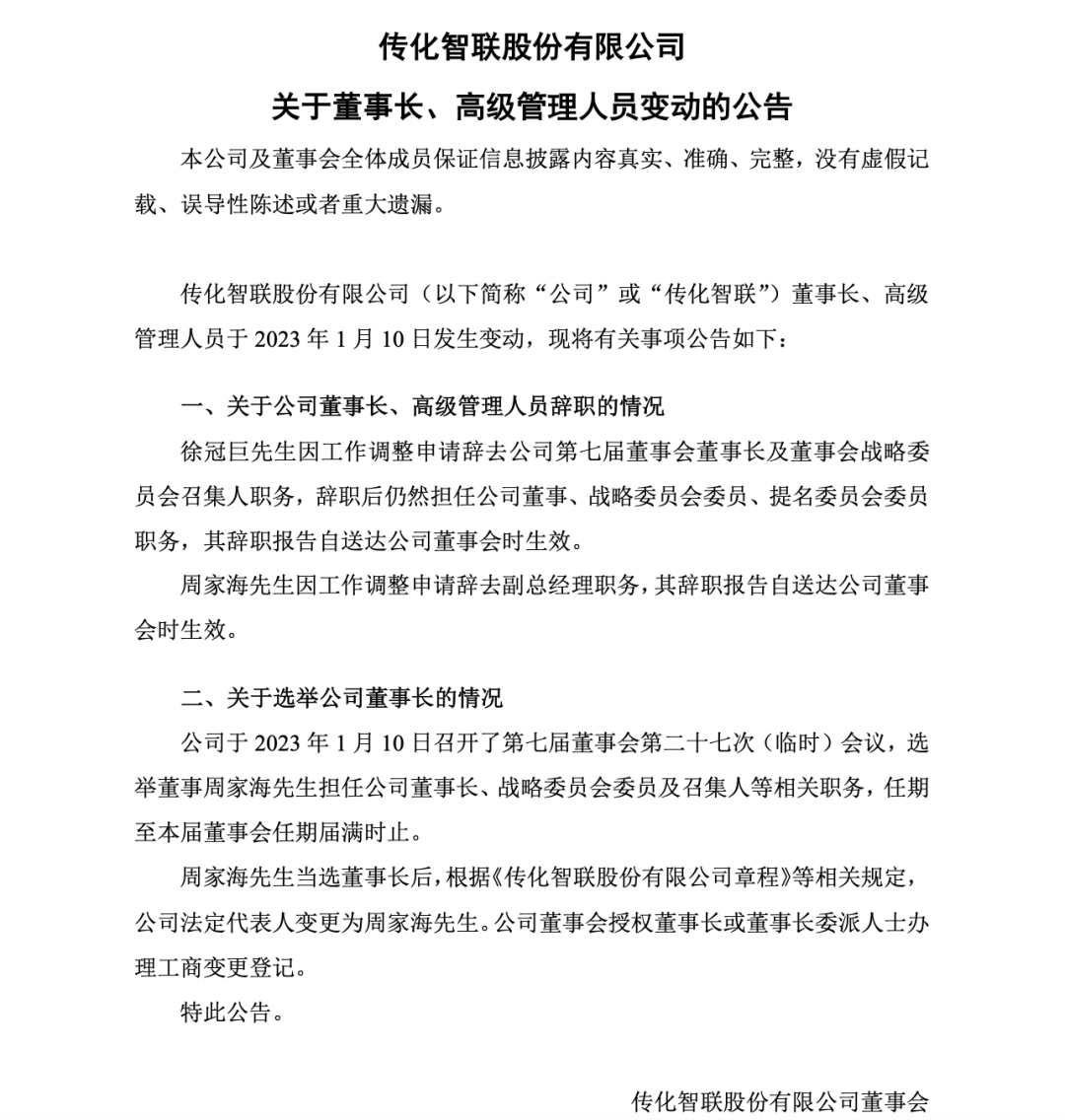 1月11日消息,传化智联发布关于董事长、高级管理人员变动的公告。公告称,徐冠巨因工作调整申请辞去公司第七届董事会董事长及董事会战略委员会召集人职务,辞职后仍然担任公司董事、战略委员会委员、提名委员会委员职务,其辞职报告自送达公司董事会时生效。 周家海因工作调整申请辞去副总经理职务,其辞职报告自送达公司董事会时生效。 公告还表示,公司于2023年1月10日召开了第七届董事会第二十七次(临时)会议,选举董事周家海担任公司董事长、战略委员会委员及召集人等相关职务,任期至本届董事会任期届满时止。周家海当选董事长后,根据《传化智联股份有限公司章程》等相关规定,公司法定代表人变更为周家海。 据传化智联官网显示,周家海1975年出生,硕士学历,1996年参加工作。曾就职于传化集团、新安化工,担任传化集团董事长助理、新安化工副总裁兼无机硅事业部总经理,现任新安化工董事、本公司董事长。 官网还显示,传化智联是传化集团旗下A股上市公司。传化智联的主营业务传化智能物流服务平台以“物流+科技+金融”的平台模式,聚焦服务中国制造,通过线上传化货运网和线下公路港城市物流中心互相协同的方式,以数字化智能技术助力制造业客户转型升级,聚焦解决企业间、区域间、省际间货物高效流转问题,以平台化与数字化使能物流企业高效服务制造业货主企业。目前已建设形成“传化货运网”、“智能公路港”、“科技金融”三大线上线下融合的服务体系。 2022年10月25日,传化智联发布2022年三季报。根据财报显示,本报告期中传化智联增收不增利。截至本报告期末,传化智联营业总收入282.61亿元,同比上升11.4%,归母净利润6.05亿元,同比下降35.35%。按本报告期单季度数据看,本季度营业总收入98.13亿元,同比上升4.78%,本季度归母净利润1.57亿元,同比下降59.83%。 2022年8月22日,传化智联发布2022年半年报,报告期内,传化智联实现营业收入183.97亿元,同比增长15.35%;归属于上市公司股东的净利润4.49亿元。2022年半年报显示,报告期内,传化智能物流服务平台围绕传化货运网建设,进一步完善传化货运网模式、技术、产品布局,形成传化货运网-数字化运输服务(整车、零担)、港仓解决方案,协同智能公路港服务、金融服务,以平台模式深入服务制造企业。 2022年半年报还显示,智能公路港是传化智联物流业务的线下基底,传化智联持续推进公路港的全国化布局,在管资产规模持续增长,在建及筹建公路港13个;2023年上半年实现营业收入6.40亿元,同比增长4.82%,毛利率66.56%,同比提升0.87个百分点。截至报告期末,传化智联已布局公路港74个,经营面积538.7万平方米。全国公路港物业整体出租率89%;公路港入驻企业11000家,车流总量达到2758万辆,同比略有增长;港内平台营业额实现326.5亿元。 如今,徐冠巨辞任董事长,周家海当选,那么接下来传化智联将迎来怎么样的发展,我们拭目以待。