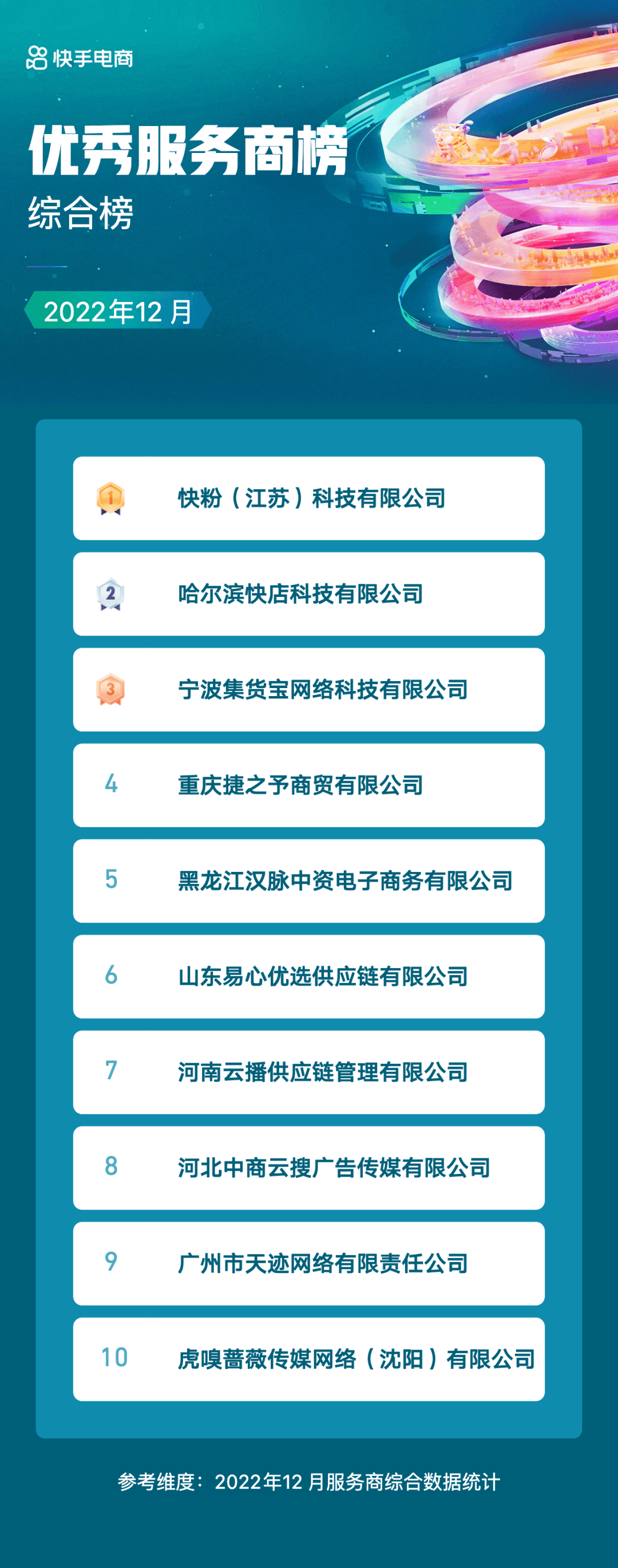 1月20日,快手电商服务商2022年度12月榜单发布。 其中,快手电商优秀服务商榜综合榜TOP10商家分别为快粉(江苏)科技有限公司、哈尔滨快店科技有限公司、宁波集货宝网络科技有限公司、重庆捷之予商贸有限公司、黑龙江汉脉中资电子商务有限公司、山东易心优选供应链有限公司、河南云播供应链管理有限公司、河北中商云搜广告传媒有限公司、广州市天迹网络有限责任公司、虎嗅蔷薇传媒网络(沈阳)有限公司。