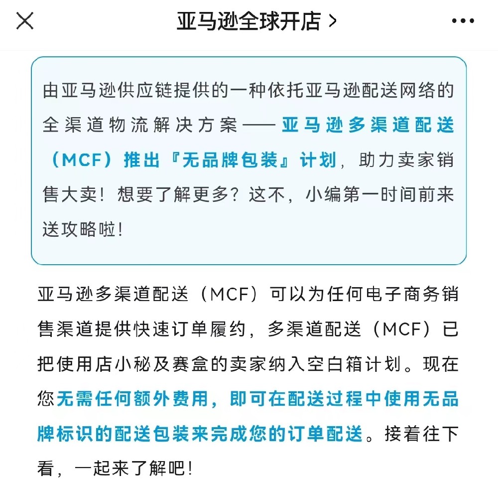 由亚马逊供应链提供的一种依托亚马逊配送网络的全渠道物流解决方案——亚马逊多渠道配送(MCF)推出“无品牌包装”计划,助力卖家销售大卖。亚马逊多渠道配送(MCF)可以为任何电子商务销售渠道提供快速订单履约,多渠道配送(MCF)已把使用店小秘及赛盒的卖家纳入空白箱计划。“无品牌包装”是指,订单将自动以无品牌包装发...