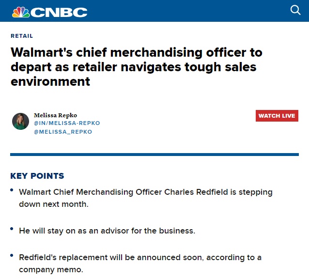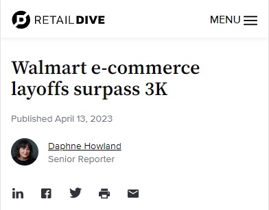 1.裁员超三千人沃尔玛的裁员没有停止的迹象。近日,沃尔玛已宣布关闭多个电商配送中心。目前已经证实,美国佛罗里达州的电商配送中心将在6月前裁员400人,新泽西州将有约200人收到裁员通知,加州的配送中心将裁员900多人。据估计,沃尔玛在全国范围内的裁员将影响约3000人。相关负责人表示,公司将向所有受到影响的员工提供...