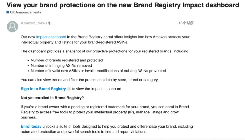 一、加大保护力度俗话说,工欲善其事,必先利其器。亚马逊自然深知这一点。近年来,为了支持更多的卖家建立和发展业务,亚马逊开发了各种工具为卖家提供服务。近日,亚马逊美洲站和欧洲站相继发布公告,称为了加强对卖家注册品牌的保护,将推出新的“品牌注册影响仪表板”。通过该工具,卖家不仅可以清楚地看到其账户下注册...