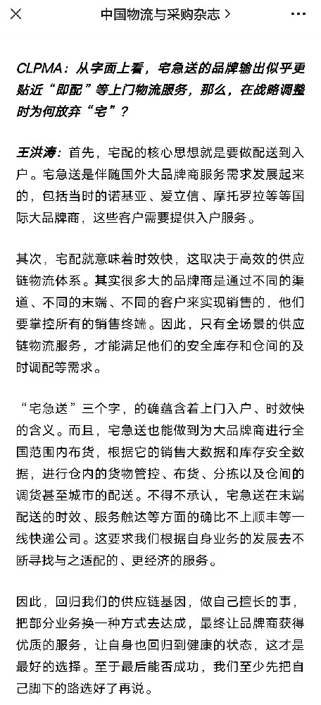 3月14日消息,宅急送董事长王洪涛近日在接受采访时表示,宅急送战略调整已接近尾声。据介绍,目前宅急送90%的客户为大型品牌商。基于此,宅急送今后的主要产品体系为供应链物流、数据服务、供应链管理和供应链金融科技服务,以帮助品牌商提升供应链物流的整体效益和效能。未来宅急送将不再100%直营,部分自有员工、加盟商会...