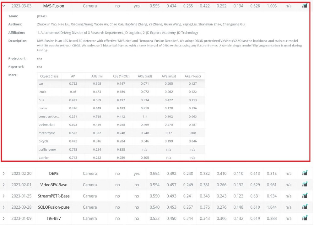 3月14日消息,京东物流X业务部联合京东探索研究院自研算法“MVS-Fusion”近日通过纯视觉3D目标检测,以55.54%的mAP(平均精度均值)在不使用未来帧数据的算法中,登顶国际权威自动驾驶视觉算法榜单nuScenes。这是继去年京东物流智能驾驶团队提出的前融合算法“PAI3D”登上榜首后,首次在纯视觉领域获得第一。(图源 京东物流...