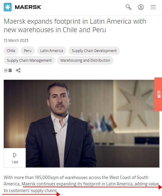 3月14日消息,马士基近日宣布在智利和秘鲁建立新仓库,扩大在拉丁美洲的业务。目前,马士基在南美洲西海岸拥有超过195,000平方米的仓库,继续扩大其在拉丁美洲的足迹,可为客户的供应链增加价值。据了解,在智利和秘鲁的新设施是马士基在该地区投资的一部分,以继续建设马士基的仓储和合同物流业务,这是马士基成为全球集装...