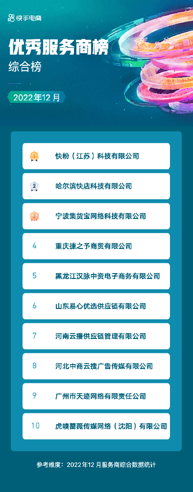 1月20日,快手电商服务商2022年度12月榜单发布。其中,快手电商优秀服务商榜综合榜TOP10商家分别为快粉(江苏)科技有限公司、哈尔滨快店科技有限公司、宁波集货宝网络科技有限公司、重庆捷之予商贸有限公司、黑龙江汉脉中资电子商务有限公司、山东易心优选供应链有限公司、河南云播供应链管理有限公司、河北中商云搜广告传...