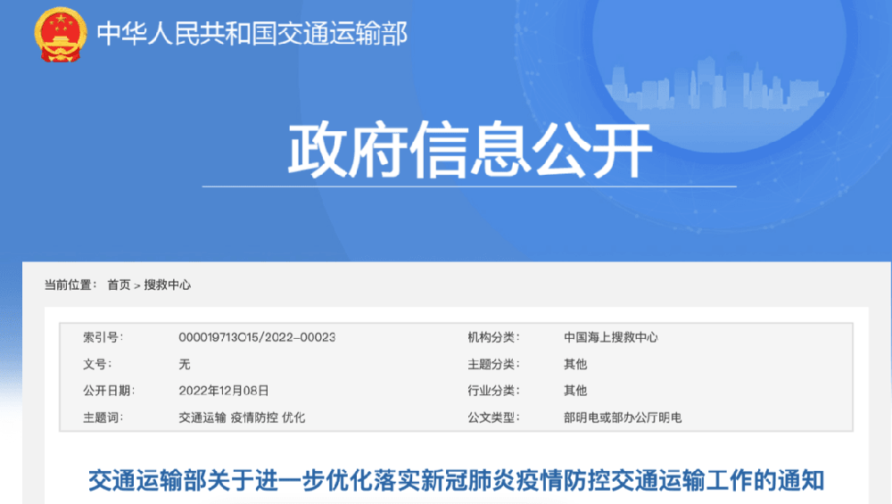 12月8日,交通运输部发布关于进一步优化落实新冠肺炎疫情防控交通运输工作的通知。通知指出,坚持第九版防控方案、落实二十条优化措施、执行好《关于进一步优化落实新冠肺炎疫情防控措施的通知》要求,更加科学精准做好新冠肺炎疫情防控涉交通运输工作。原文如下:各省、自治区、直辖市、新疆生产建设兵团交通运输厅(局、委...