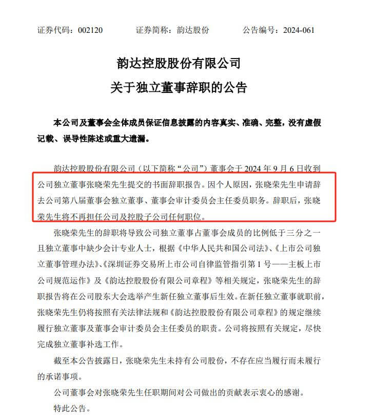 韵达股份于近日发布公告,称公司董事会于2024年9月6日接获公司独立董事张晓荣提交的书面辞职报告。鉴于个人原因,张晓荣申请辞去韵达公司第八届董事会独立董事以及董事会审计委员会主任委员职务。辞职后,张晓荣将不再担任韵达公司及其控股子公司的任何职位。韵达方面表示,张晓荣的辞职将致使公司独立董事在董事会成员中的...