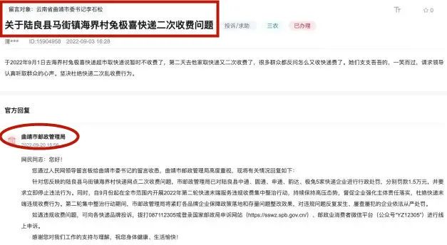 人民网“领导留言板”显示,9月20日,对于网民提出的“陆良县马街镇海界村快递网点二次收费问题”,云南省曲靖市邮政管理局回复称,市邮政管理局已对陆良县中通、圆通、申通、韵达、极兔5家快递企业进行行政处罚,分别罚款1.5万元,并要求立即停止违法行为。网民在投诉中提到,其于9月1日到海界村兔喜快递超市取快递,当时工...