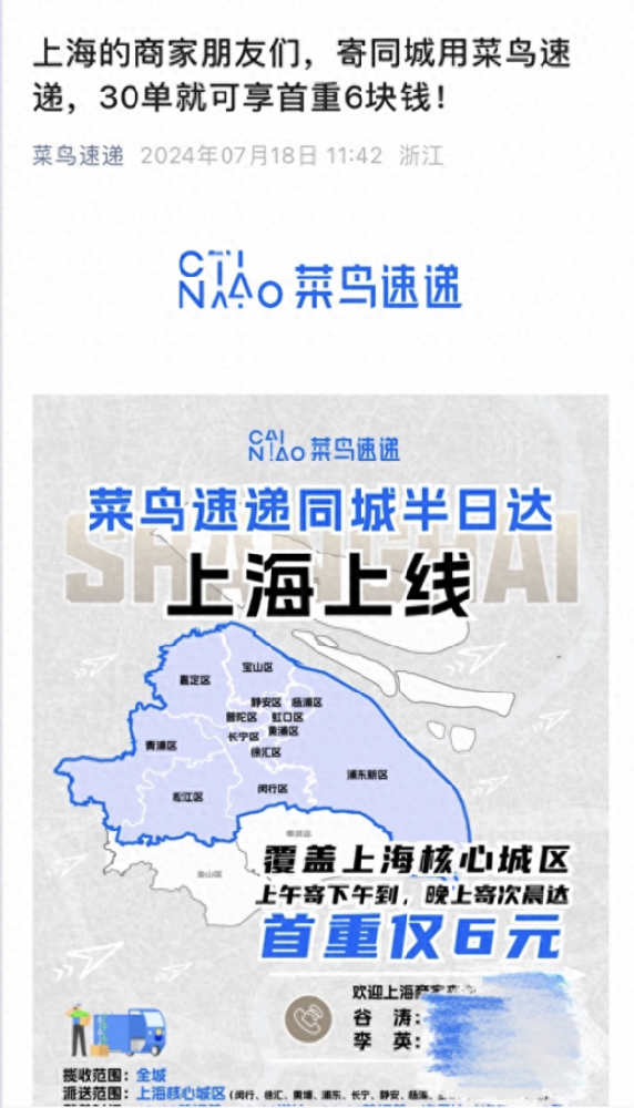菜鸟速递公众号所推送的消息表明,继于广州完成同城快递的升级之后,上海与南京亦已实现升级,上午进行寄送,下午即可送达,其价格为同类型产品的 5 – 8 折。据内部人士透露,首批升级城市正在逐步上线,数量将逾 20 个。据悉,七月初,菜鸟速递于南京城内悄然展开同城快递的升级尝试,将以往的次日达服务升级为半日达。当...