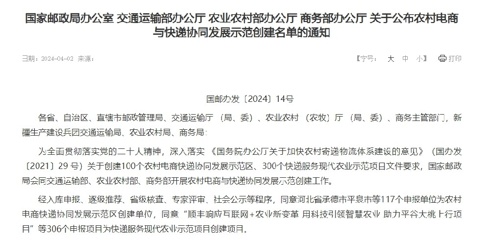 国家邮政局网站近日发布《国家邮政局办公室 交通运输部办公厅 农业农村部办公厅 商务部办公厅 关于公布农村电商与快递协同发展示范创建名单的通知》(以下简称《通知》)称,为深入落实《国务院办公厅关于加快农村寄递物流体系建设的意见》关于创建100个农村电商快递协同发展示范区、300个快递服务现代农业示范项目文件要求...