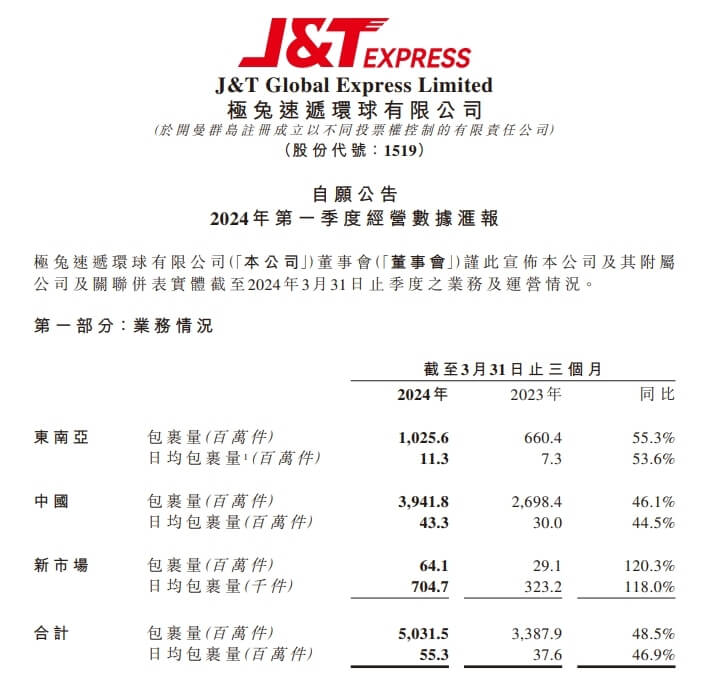 极兔速递发布了2024年第一季度经营数据汇报,包裹量大涨。2024年第一季度,极兔速递实现了包裹量50.32亿件,同比增长48.5%,日均包裹量达到了5530万件,同比增长46.9%。其中,中国包裹量达39.418亿件,同比增长46.1%,日均包裹量达4330万件,同比增长44.5%。同期,东南亚包裹量达10.256亿件,同比增长55.3%,日均包裹量达11...
