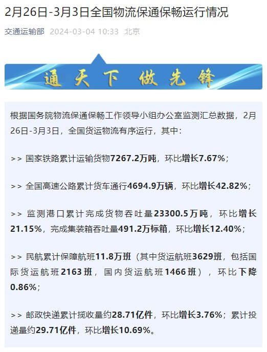 根据国务院物流保通保畅工作领导小组办公室监测汇总数据,2月26日-3月3日,国家铁路累计运输货物7267.2万吨,环比增长7.67%;全国高速公路累计货车通行4694.9万辆,环比增长42.82%;监测港口累计完成货物吞吐量23300.5万吨,环比增长21.15%,完成集装箱吞吐量491.2万标箱,环比增长12.40%。邮政快递累计揽收量约28.71亿件,...