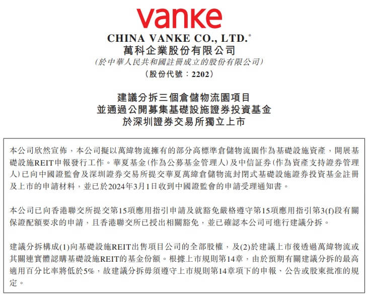 万科公告,拟以万纬物流拥有的部分高标准仓储物流园作为基础设施资产,开展基础设施REITs申报发行工作。华夏基金(作为公募基金管理人)及中信证券(作为资产支持证券管理人)已向中国证监会及深圳证券交易所提交华夏万纬仓储物流封闭式基础设施证券投资基金注册及上市的申请材料,并已于2024年3月1日收到中国证监会的申请受...