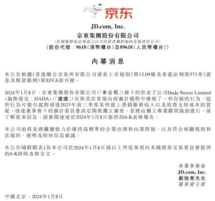 达达集团发布公告,针对此前内审主动发现的个别存疑业务的审查结果已明确,独立第三方机构审查结果表明,公司管理层没有参与策划,为个别员工所为。目前已对相关员工进行处理,公司后续将进一步规范企业治理和内部流程,严格遵照相关法规进行透明、及时的信息披露。1月8日,京东集团旗下并表子公司Dada Nexus Limited(达达...