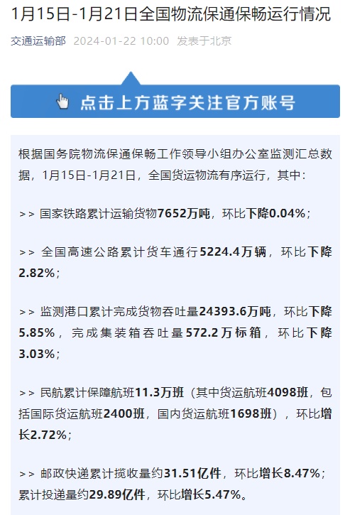 根据国务院物流保通保畅工作领导小组办公室监测汇总数据,1月15日-1月21日,国家铁路累计运输货物7652万吨,环比下降0.04%;全国高速公路累计货车通行5224.4万辆,环比降2.82%;监测港口累计完成货物吞吐量24393.6万吨,环比下降5.85%,完成集装箱吞吐量572.2万标箱,环比下降3.03%。邮政快递累计揽收量约31.51亿件,环比增...