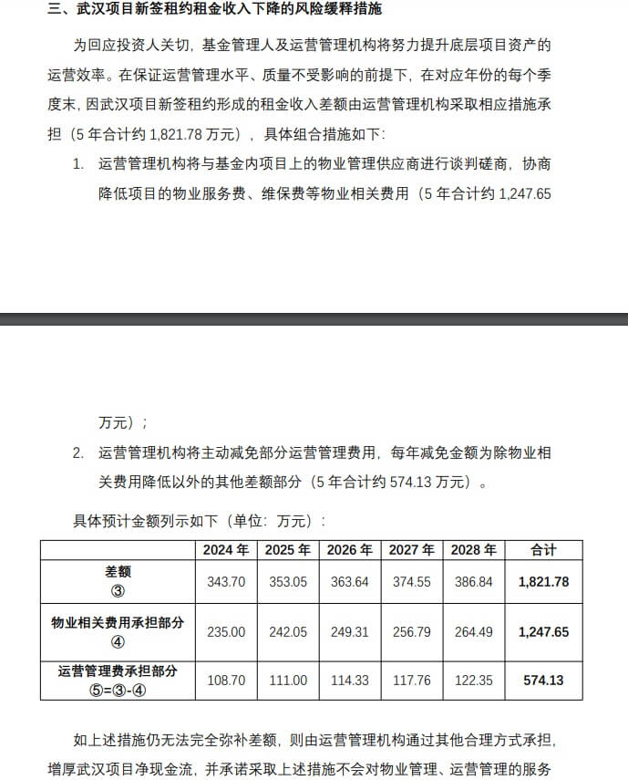 嘉实京东仓储物流封闭式基础设施证券投资基金(以下简称“基金”或“嘉实京东仓储基础设施REIT”)日前发布关于武汉项目租金下降风险缓释措施的公告。公告称,为回应投资人关切,基金管理人及运营管理机构将努力提升底层项目资产的运营效率。在保证运营管理水平、质量不受影响的前提下,在对应年份的每个季度末,因武汉项目...