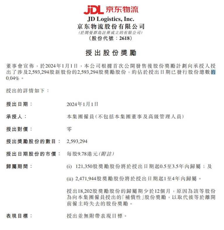 京东物流发布公告称,于2024年1月1日,公司根据首次公开发售后股份奖励计划向承授人授出了涉及259.33万股新股份的259.33万股奖励股份,约占于授出日期已发行股份总数的0.04%。根据公告,此次授出不会导致在直至授予日期的12个月期间内,授予及将授予每个个体承授人的购股权和奖励总计超过已发行股份的1%。此次授出无需获得股...