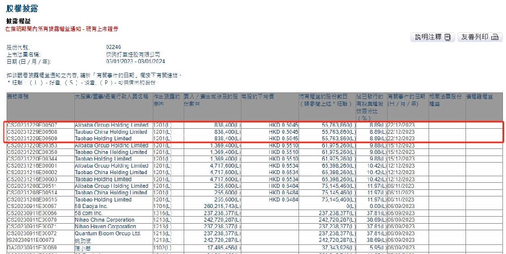 港交所文件显示,阿里巴巴集团于2023年12月22日以平均每股0.5045港元的价格出售了83.84万股快狗打车股份,持股比例降至8.89%。交易价值约为42.3万港元。上市后,阿里多次减持快狗打车,2022年9月,阿里以每股6.3572港元的均价出售23.24万股快狗打车股票,持股比例降至13.99%,之后阿里持股比例进一步下降,在2023年8月快狗打...