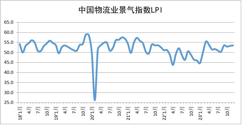 中国物流与采购联合会今日公布2023年12月份中国物流业景气指数。尽管受年末上游需求放缓和部分地区恶劣天气因素影响,物流业务量增速较前期有所放缓,但12月份物流业景气指数仍保持企稳回升态势,业务量平稳增长。2023年12月份,中国物流业景气指数为53.5%,比2023年11月份上升0.2个百分点。主要指标中,业务总量指数、新订...