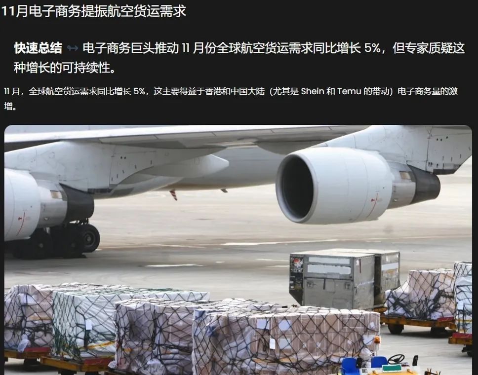 1.带动货运增长以SHEIN和Temu为代表的中国跨境电商平台,在全球货运需求增长方面起到了重要助力。近日,Xeneta旗下的行业分析机构克莱夫数据服务公司(CLIVE data Services)发布了一项数据,据数据显示,在中国跨境电商交易量激增的带动下,今年11月份全球航空货运需求同比增长了5%。SHEIN和Temu带动货运需求增长 图源:ca...