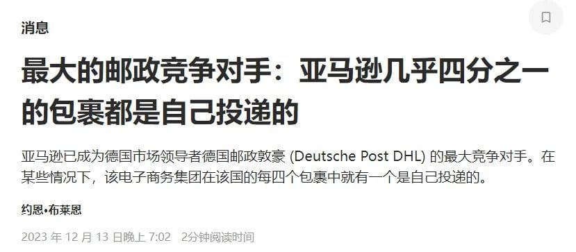 1.物流业务崛起在平台电商主业稳健发展的同时,亚马逊在物流领域也在持续建设,以提高自身的服务质量。而经过长时间的发展后,亚马逊同样取得了非凡的成绩。近日,德国联邦网络局表示,亚马逊成为了继DHL之后德国第二大快递服务提供商,现如今有几乎四分之一的包裹都是自己投递的,随着自行投递包裹数量的不断增加,DHL的霸...