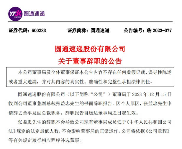 圆通速递发布公告称,于2023年12月15日收到公司董事兼副总裁张益忠的书面辞职报告。因个人原因,张益忠申请辞去董事及副总裁职务。辞职报告自送达董事局之日起生效。张益忠的辞职不会导致公司现有董事局成员低于《中华人民共和国公司法》规定的法定最低人数,不会影响董事局的正常运作。公司将依据《公司章程》 等有关规定履...