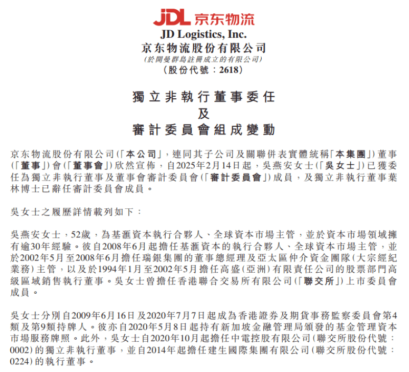 京东物流公告,自2025年2月14日起,吴燕安已获委任为独立非执行董事及董事会审计委员会成员,独立非执行董事叶林博士已辞任审计委员会成员。截至本公告日期及于上述董事委任后,董事会包括执行董事胡伟先生,非执行董事刘强东先生及独立非执行董事顾宜女士、吴燕安女士、赵先德博士、张扬先生及叶林博士。图源:京东物流港交...