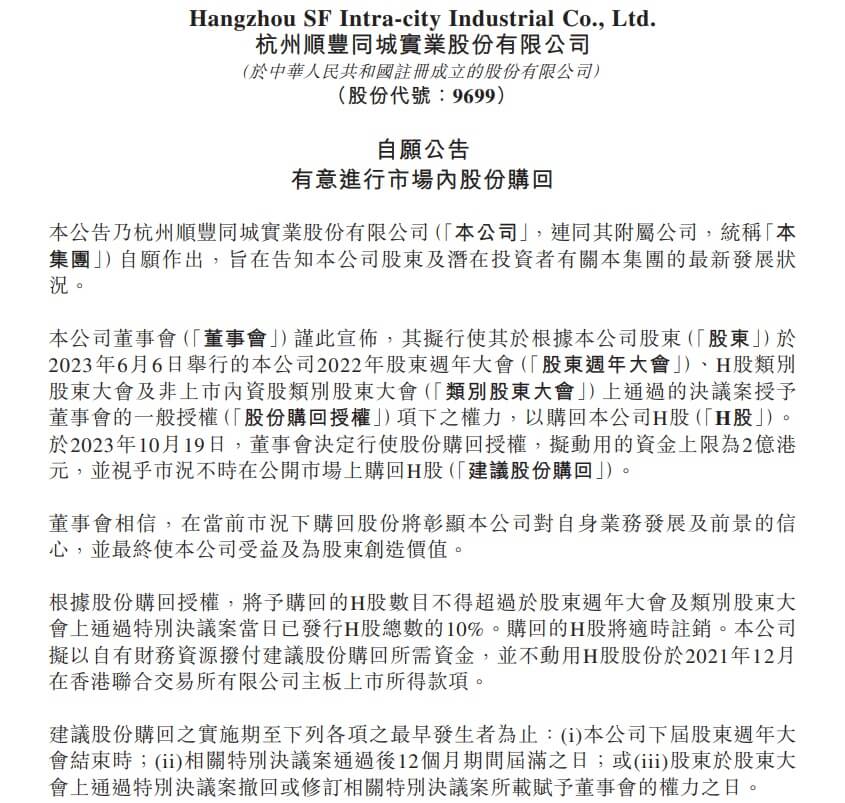 顺丰同城日前在港交所发布公告称,公司拟行使其一般授权下的股份回购授权,回购不超过年度股东大会及类别股东大会通过特别决议当日已发行h股总数10%的公司h股股份,涉及资金上限2亿港元。公告称,顺丰同城董事会已决定于2023年6月6日行使股份回购授权,预计将不定期动用最多2亿港元在公开市场回购h股。回购的股份将在适当时...