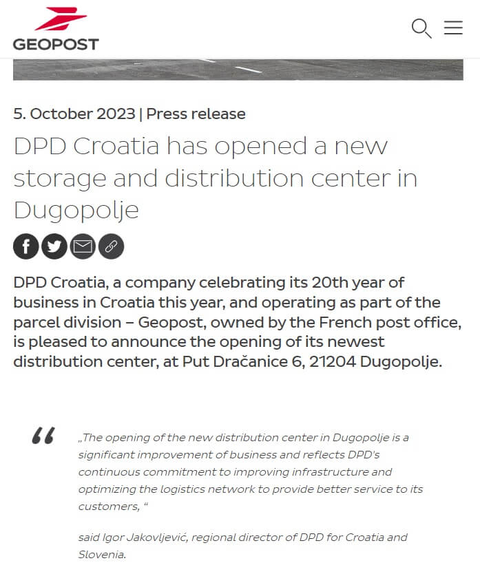 DPD克罗地亚公司今年庆祝了其在克罗地亚开业20周年,并于最近宣布开设其最新的配送中心,作为法国邮政包裹部门Geopost的一部分。DPD克罗地亚和斯洛文尼亚地区总监Igor jakovljeviki表示:“Dugopolje新配送中心的开业是业务的重大改进,反映了DPD不断努力改善基础设施和优化物流网络,为客户提供更好的服务。”。DPD克罗地亚...