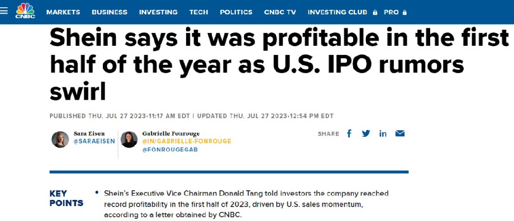 1.SHEIN上半年净利润创新高自从Temu选择以北美市场为主要业务阵地,以更激进的低价策略拓展市场后,SHEIN与Temu之间的火药味就在不胫而走。在Temu加速全球扩张的同时,SHEIN也披露了今年上半年的积极表现。近日,SHEIN执行副主席汤唯在致投资者的信中表示,SHEIN今年上半年净利润创历史新高,去年同期仅接近盈亏平衡。与去年...