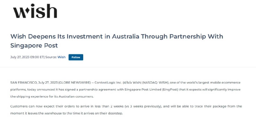 一、达成新合作物流一直是推动电子商务快速增长的重要马车。或许也正是因为如此,很多有实力的电商巨头都在不断加大在物流领域的布局,力求缩短配送时间,只有更快,没有最快。美国电商平台Wish显然也在其中。近日,Wish宣布与新加坡邮政达成合作,加深在澳洲的投资。作为合作的一部分,新加坡邮政的澳大利亚子公司Couriers...