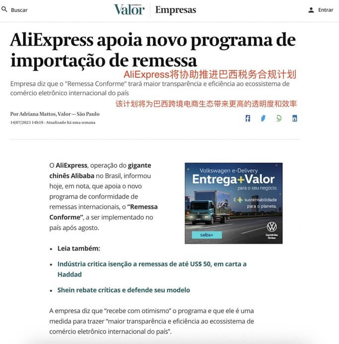 有媒体了解到,在巴西政府的要求下,速卖通(AliExpress)正在帮助推动即将出台的巴西税收遵从计划(Remessa Conforme)。根据巴西当地政策,只有支持该计划的电商平台,其商家才能在巴西享受50美元以下跨境包裹免关税和更便捷的通关服务。速卖通(AliExpress)表示将“与巴西当局合作,促进巴西数字经济的发展”。业内人士表示,...