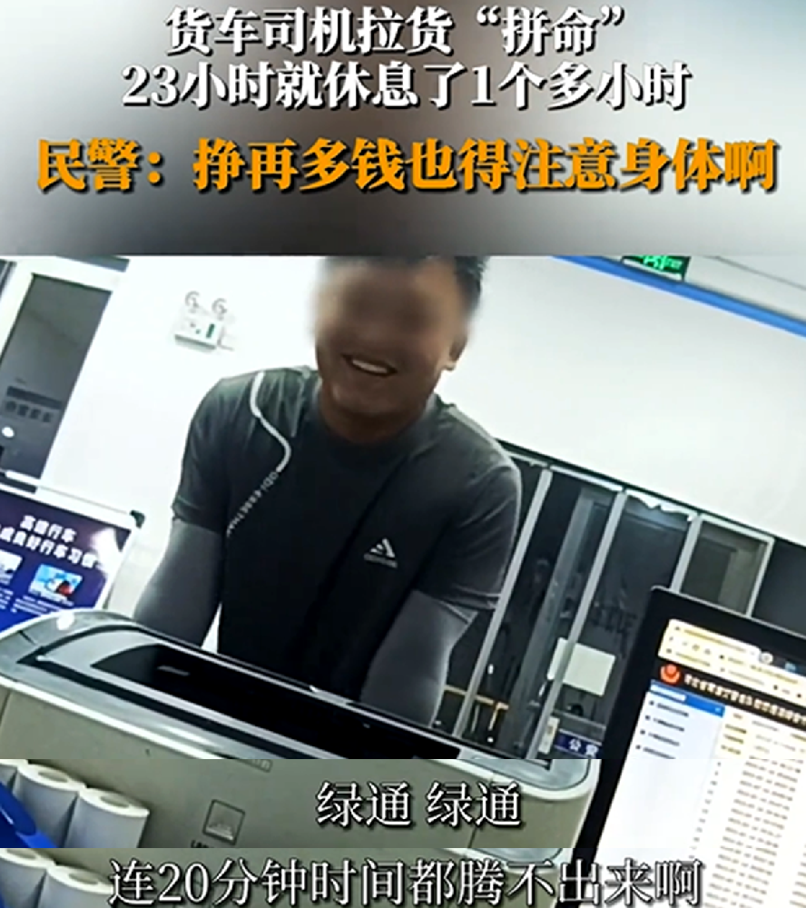 一则“货车司机拉货‘拼命’,23小时只休息了一个多小时”的视频,在网络上引起了巨大关注。视频显示,河北高速交警碰见了一位疲劳驾驶的货车司机,从北斗卫星导航记录仪来看,这位货车司机从早上7点15分出发以后,一直连续驾驶了接近23个小时,期间停车没有一次超过20分钟。对话中,我们得知这位货车司机装载的是绿通货物,...
