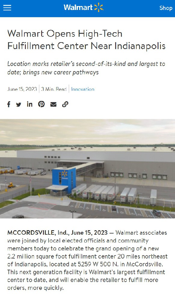 沃尔玛在印第安纳波利斯McCordsville开设一个220万平方英尺的配送中心。近日该配送中心正式开幕。这个设施是沃尔玛迄今为止最大的配送中心,也是沃尔玛今年计划开设的四个高科技配送中心中的第二个。该配送中心结合了人力资源、技术和机器学习,在提高在线订单配送能力的同时实现更快的运输和交付。据悉,该配送中心旨在扩大...