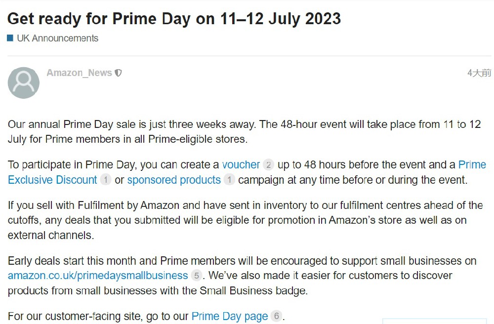 亚马逊美国站和欧洲站发布公告称,距离亚马逊一年一度的PrimeDay促销只剩下三周了。这项为期48小时的大促活动将于7月11日至12日在所有符合Prime资格的商店为Prime会员举办。亚马逊表示,如要参加PrimeDay,卖家可以在活动前48小时内创建优惠券,并在活动前或活动期间随时创建Prime专享折扣或赞助产...