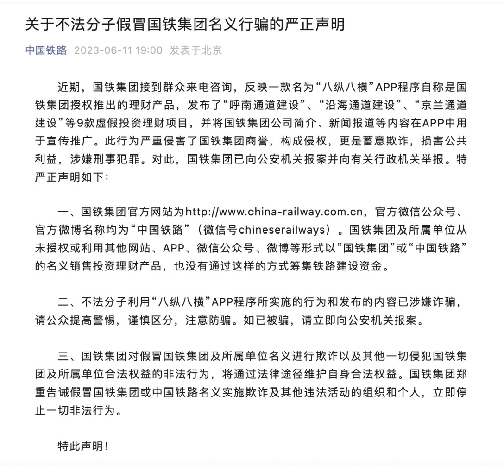 中国国家铁路集团有限公司发布《关于不法分子假冒国铁集团名义行骗的严正声明》:近期,国铁集团接到群众来电咨询,反映一款名为“八纵八横”APP程序自称是国铁集团授权推出的理财产品,发布了“呼南通道建设”、“沿海通道建设”、“京兰通道建设”等9款虚假投资理财项目,并将国铁集团公司简介、新闻报道等内容在APP中用于...