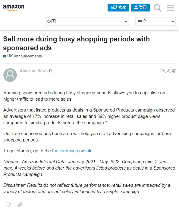 亚马逊欧洲站宣布,在热卖期投放搜索广告可以带来更高流量的更多销售,免费的搜索广告训练营将帮助卖家在购物繁忙期进行广告活动。公告称,根据亚马逊内部数据(2021年1月至2022年5月:广告主在产品促销活动中将产品列为特价商品前后四周),广告主观察到,与活动前同类产品相比,零售量平均增长17%,产品浏览量增长39%。亚马逊...