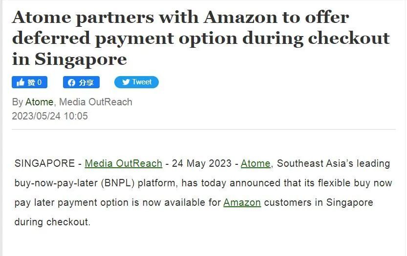 一、推出“先买后付”亚马逊再次抢占了“先买后付”的热点。消息称,亚马逊与东南亚支付巨头Atome合作,为新加坡用户推出“先买后付”(BNPL)服务。现在,Amazon.sg(亚马逊新加坡站)的用户可以使用Atome的三期支付和零利息支付选项。在使用之前,用户需要在亚马逊上绑定Atom账号。如果没有Atom账号,他们需要在苹果的App Sto...