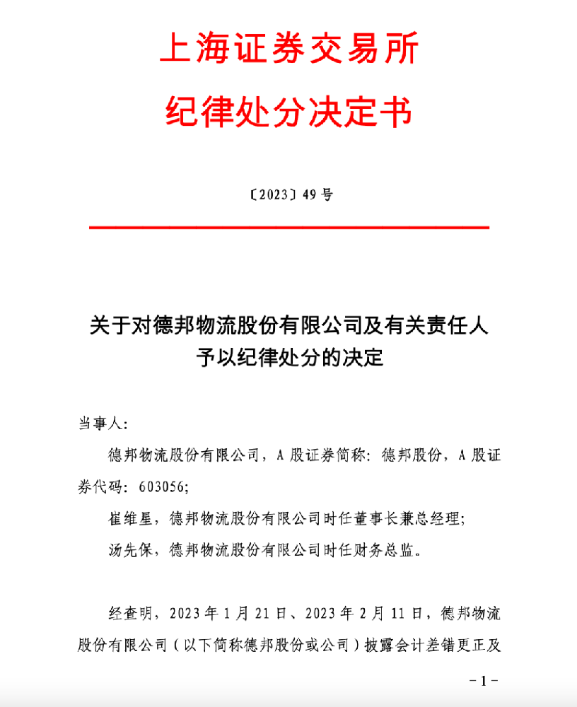 上海证券交易所发布《上海证券交易所纪律处分决定书》。上交所对德邦物流及时任董事长兼总经理崔维星、时任财务总监汤先保予以通报批评,主要因德邦多期定期报告披露的财务数据不准确。尽管在规定期限内,德邦及相关责任人作出了异议回复,而上交所在查明事实后依法依规做出了纪律处分决定:对德邦物流股份有限公司及时任董...