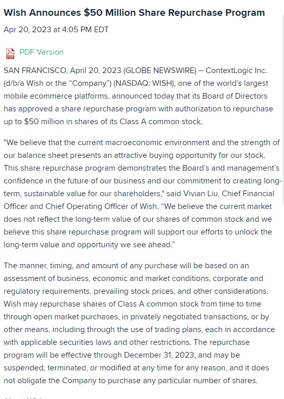 全球移动电子商务平台Wish母公司ContextLogic近日宣布,其董事会已经批准了一项股票回购计划,授权回购高达5000万美元的A类普通股。“我们认为,当前的宏观经济环境和我们资产负债表的实力为我们的股票提供了一个有吸引力的买入机会。这一股票回购计划表明了董事会和管理层对我们业务未来的信心,以及我们为股东创造长期和可...