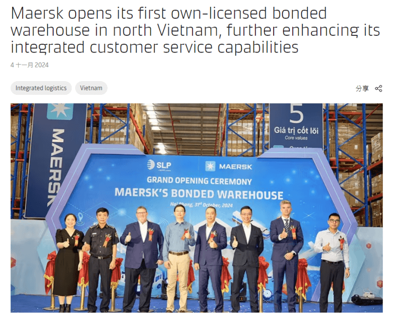 丹麦综合航运公司马士基宣布,在越南海防省南定武工业园区SLP园区设立了该公司在越南的首个保税仓库。这一举措旨在扩大其在越南北部的业务,并满足企业的进出口需求。图源:马士基新开设的保税仓库采用标准化设计,配备最新的货架系统、分类流程、库存管理和自动条形码系统。该设施还注重环保,通过最大程度地利用自然光、使...