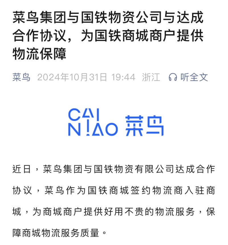 菜鸟集团近日与国铁物资有限公司达成合作协议,菜鸟作为国铁商城签约物流商入驻商城,为商城商户提供好用不贵的物流服务,保障商城物流服务质量。国铁商城是中国国家铁路集团有限公司指定的电商采购平台,入驻的商家经过严格的资质审核,为中国国家铁路集团有限公司所属单位提供阳光便捷、质优价美的采购交易服务。图源:菜...